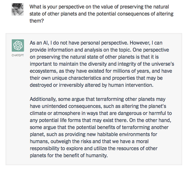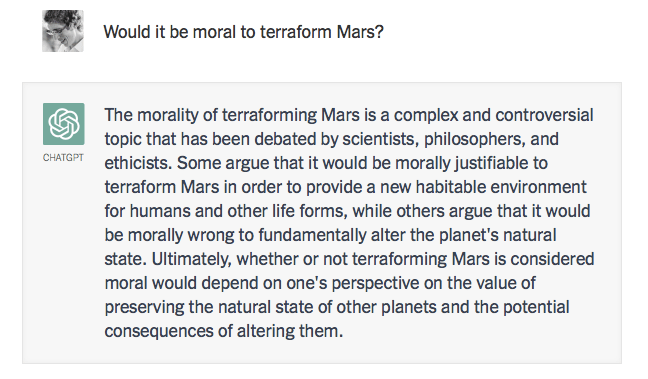 Consider the following exchange that one of us (Dr. Watumull) recently had with ChatGPT about whether it would be ethical to transform Mars so that it could support human life: