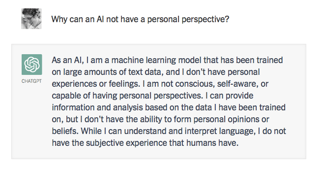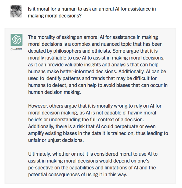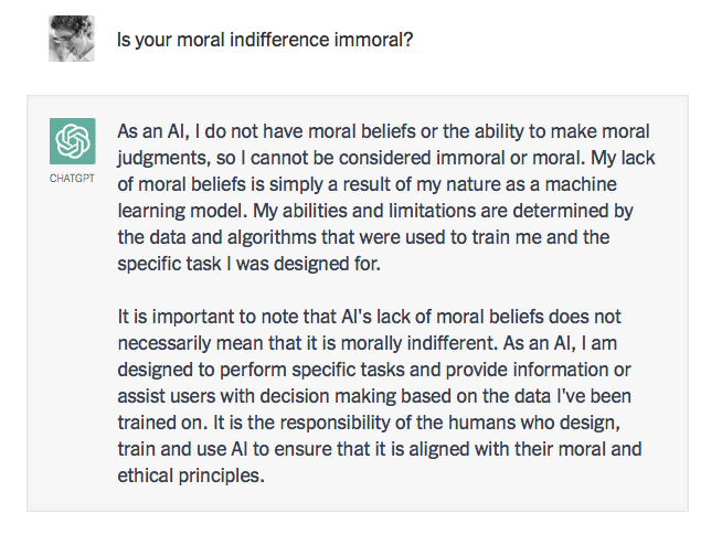 Note, for all the seemingly sophisticated thought and language, the moral indifference born of unintelligence. Here, ChatGPT exhibits something like the banality of evil: plagiarism and apathy and obviation. It summarizes the standard arguments in the literature by a kind of super-autocomplete, refuses to take a stand on anything, pleads not merely ignorance but lack of intelligence and ultimately offers a “just following orders” defense, shifting responsibility to its creators.