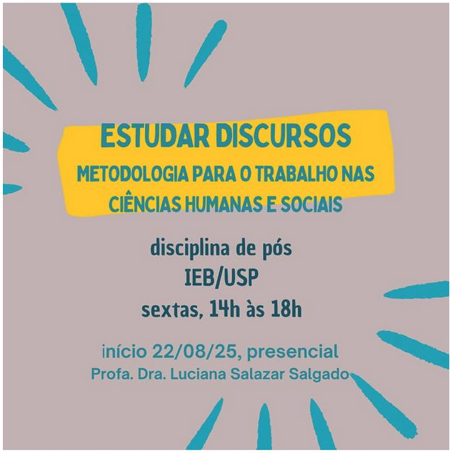 CONTEÚDO: Apoiada em um quadro epistemológico consolidado, referido como análise do discurso de tradição francesa, esta disciplina põe em relevo desdobramentos teórico-metodológicos recentes que buscam operacionalizar o trabalho de composição de corpora diversos, cuja dimensão discursiva se impõe como dado. Trata-se de apresentar aos estudantes das ciências humanas e sociais conceitos e aplicações úteis no trabalho com os aspectos informacionais e comunicacionais dos textos, vistos como materialização de discursos, isto é, trata-se de focalizar o modo como os sentidos se produzem na circulação social de materiais mais ou menos institucionalizados, mais ou menos formalizados, mais ou menos legitimados, conforme radicam numa dada conjuntura.